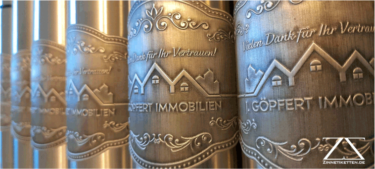 Sehr edel. Sehr auffällig ist Messing. Für Flaschen weniger geeignet, weil es bei Rundungen nicht besonders lange kleben bleibt, lässt es sich um so mehr z.B. als Werbeanbringung auf unseren Notizbüchern veredeln.